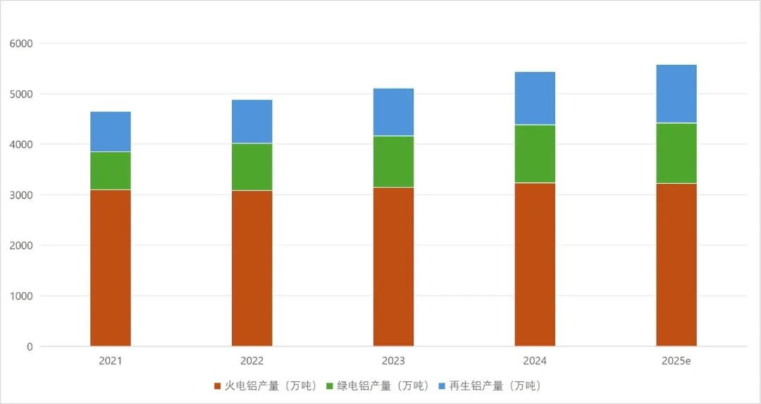 “十四五”期間,綠電鋁、再生鋁、火電鋁產(chǎn)量比重增長趨勢圖