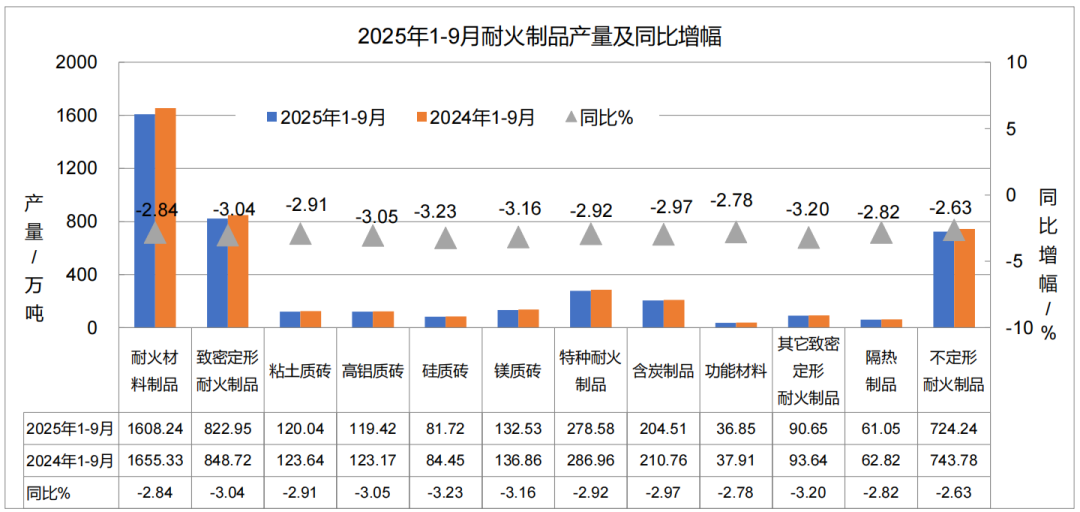 1-9月,協(xié)會同口徑統(tǒng)計,全國耐火材料制品產(chǎn)量1608.24萬噸,同比降低2.84%。其中致密定形耐火制品822.95萬噸,同比降低3.04%;保溫隔熱耐火制品61.05萬噸,同比降低2.82%;不定形耐火制品724.21萬噸,同比降低2.63%,主要品種產(chǎn)量見圖1。