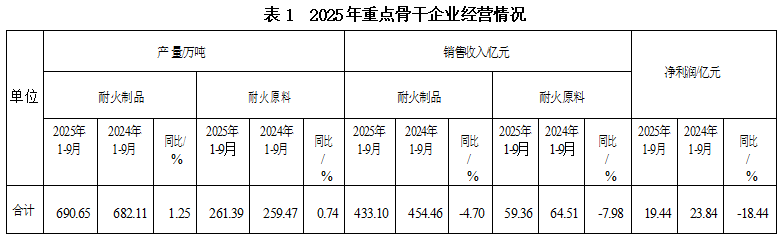 協(xié)會通過對113家重點耐火材料企業(yè)2025年1-9月經(jīng)營情況調(diào)研顯示,耐火材料產(chǎn)量952.04萬噸(含部分耐火原料),同比增長1.11%;113家企業(yè)耐火制品產(chǎn)量690.65 萬噸,同比增長1.25 %。耐火材料銷售總收入492.46億元,同比降低5.11 %;剔除原料,其中耐火制品銷售總收入433.10億元,同比降低4.70%。113家企業(yè)實現(xiàn)利潤19.44 億元,同比下降18.44%,銷售利潤率約3.95%;上繳稅金25.50億元,同比下降4.00%。表1列出了上述調(diào)查情況。